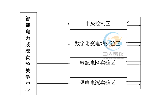 智能電力系統(tǒng)實驗教學中心由中央控制區(qū)、數(shù)字化變電站實驗區(qū)、輸配電網(wǎng)實驗區(qū)、供電電源實驗區(qū)等四個實驗區(qū)組成系統(tǒng)。各實驗區(qū)之間由電纜連接,完全按照電力系統(tǒng)規(guī)范設計,具有很強地擴展性,各室內容、規(guī)模均可增加,接口可以接納電力系統(tǒng)新技術新設備。實驗教學中心組成示意圖如圖所示。